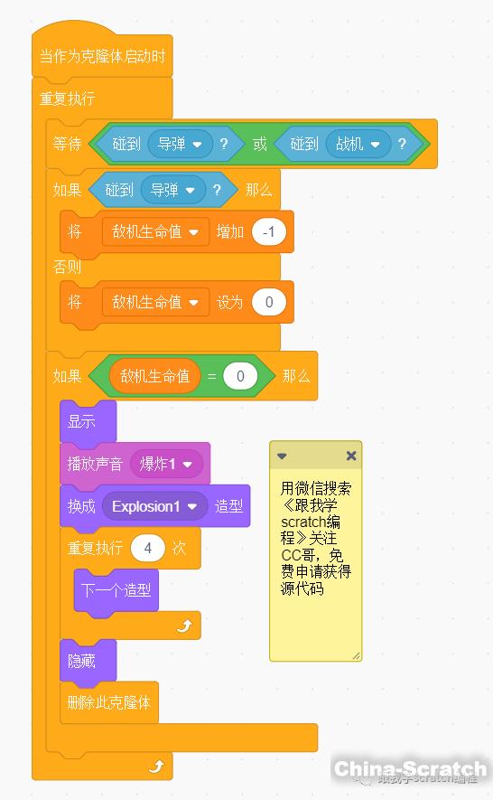 CC哥沒有刪除克隆體的偵測條件沒有用“碰到舞臺邊緣”是因為,克隆體的出場位置就已經是在舞臺邊緣上了,所以這個檢測就沒有意義。只能用敵機的位置作為判斷條件才合理。